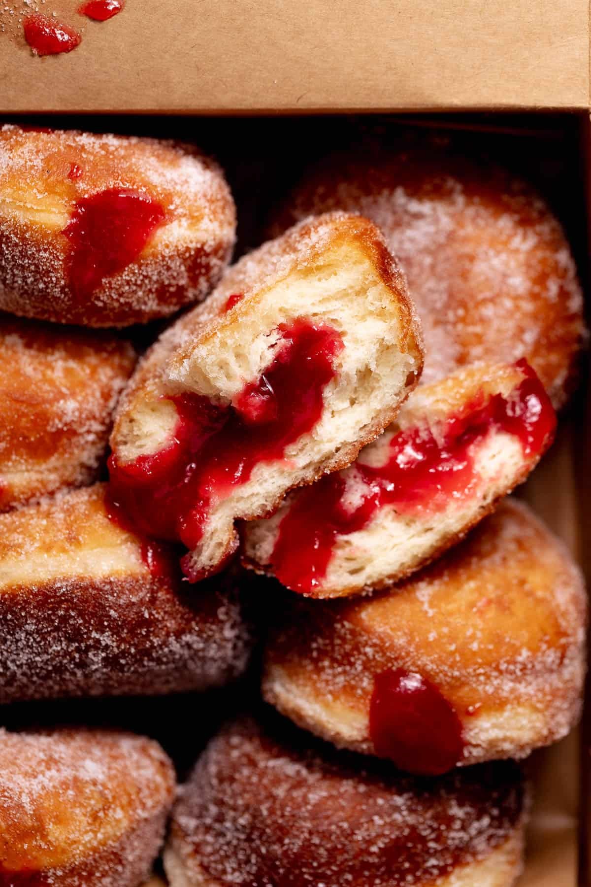 These raspberry jelly-filled donuts are soft, fluffy, fried until golden brown, sugar-dusted, then filled with real fruit jelly. Made with a simple milk-bread yeast dough and fully customizable fillings, they’re approachable to make at home while still delivering better than bakery results!